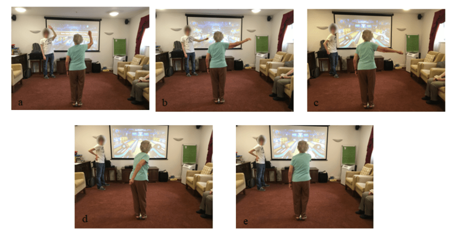 To learn the bowling activity, participants were instructed to do five steps (Figure 2a-e): (a) raise their main arm above their head; (b) place their arm to the side, parallel to the ground; (c) close their hand to make a fist; (d) swing their arm behind them; and (e) swing it forward again while opening their hand.